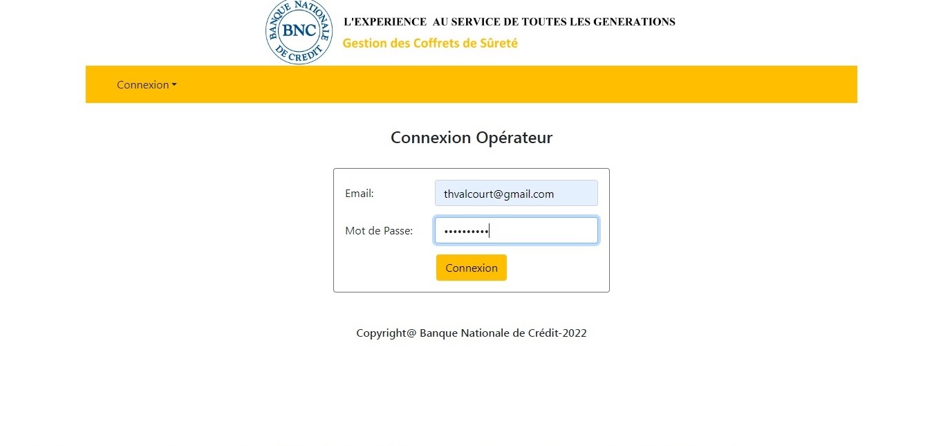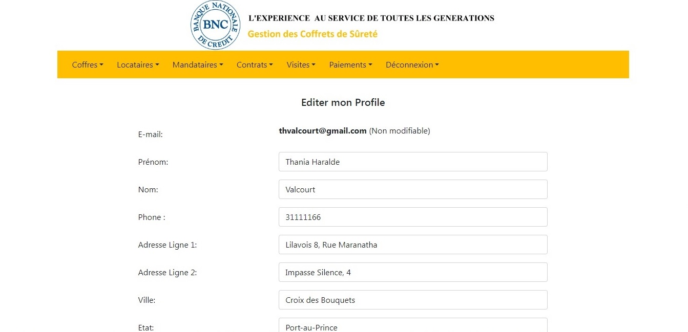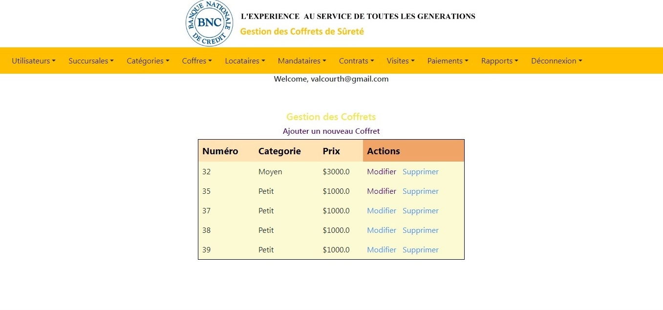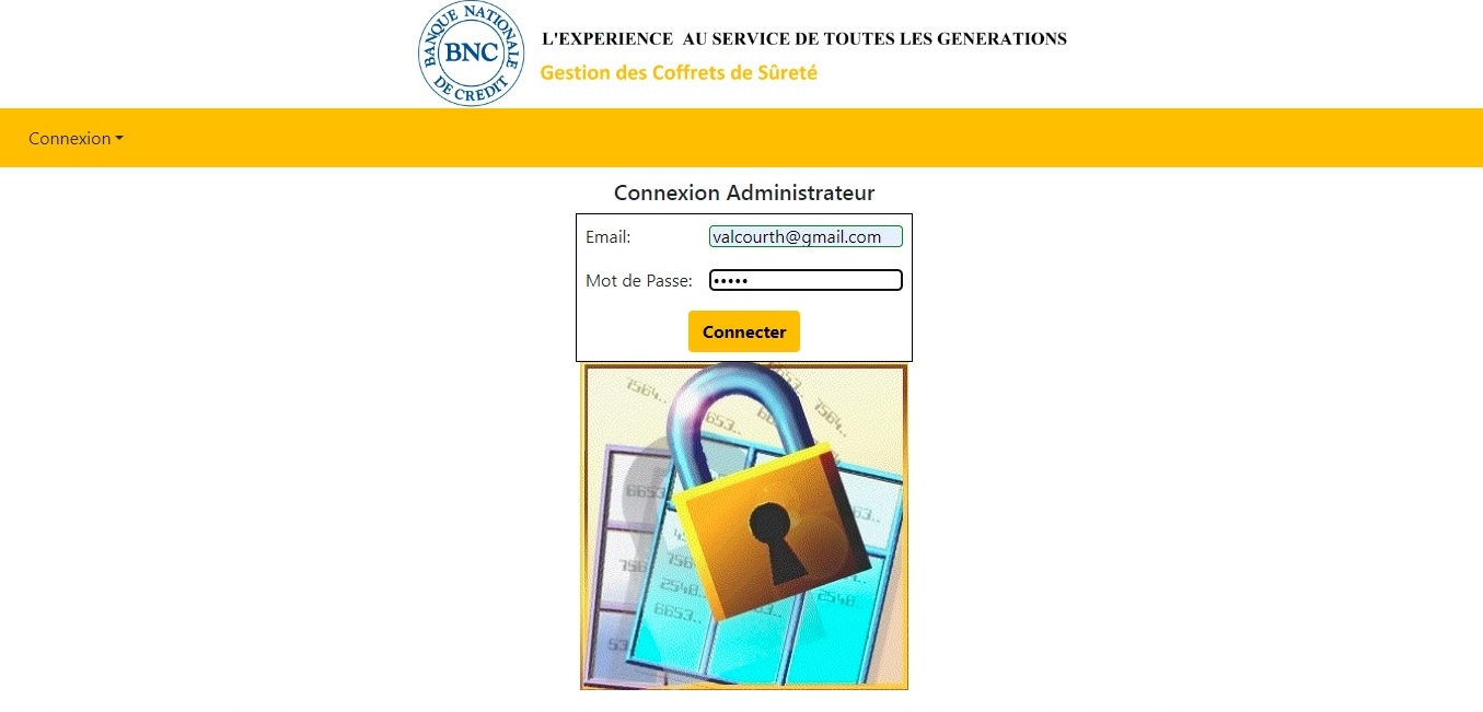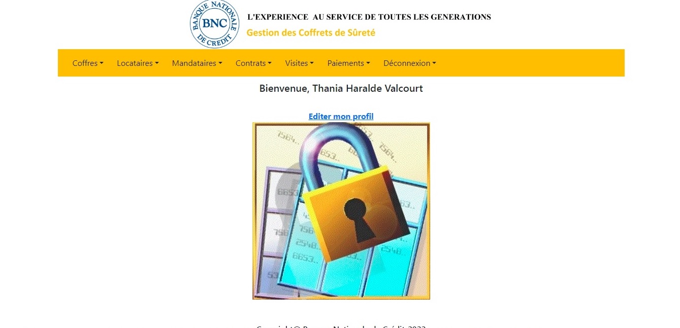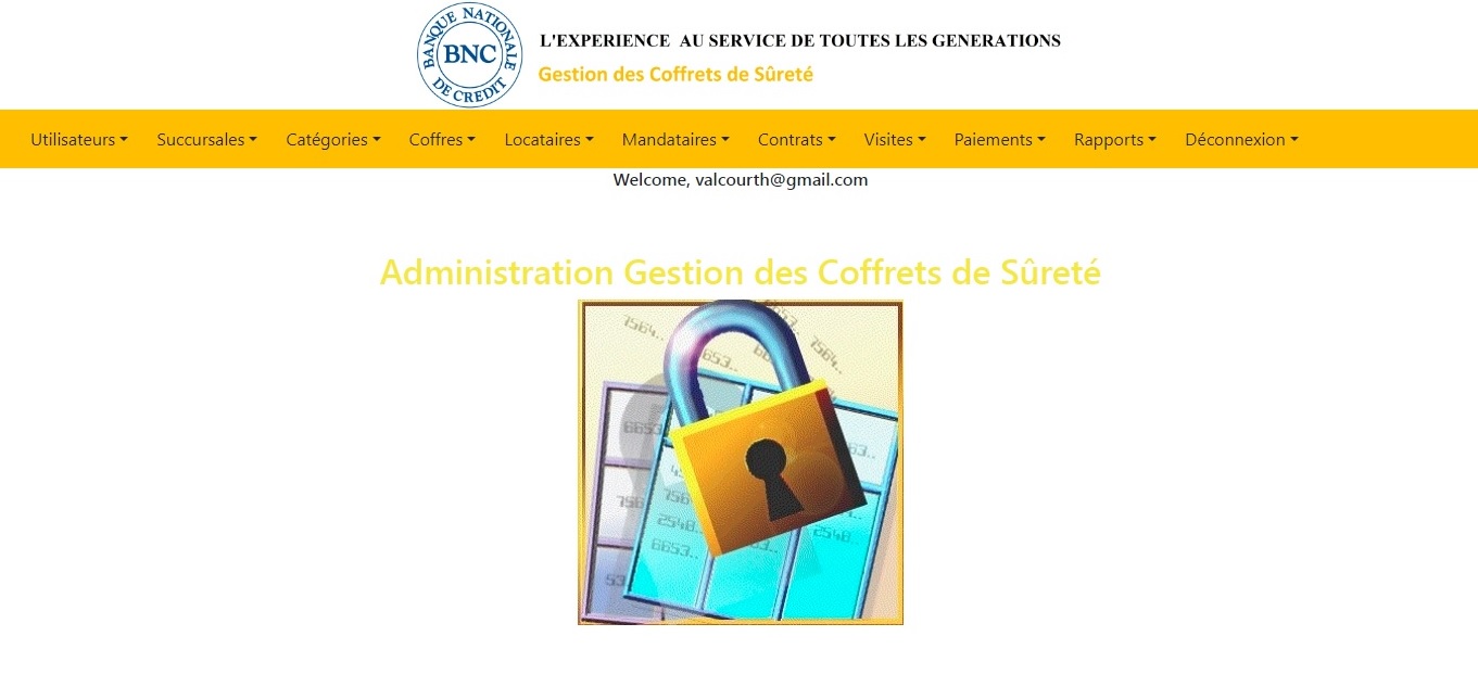 Cette Application Web dynamique, développée en 2022, remplace l'ancienne application de Gestion des coffrets de sûreté de la BNC. Cette version permet aux Succursales de gérer les coffrets de sûreté, les locataires, les mandataires, les visites et les paiements.