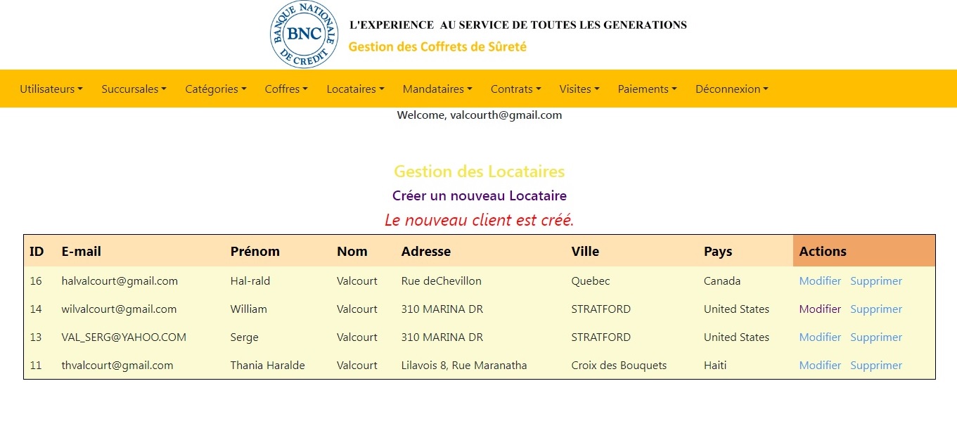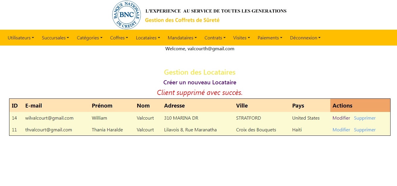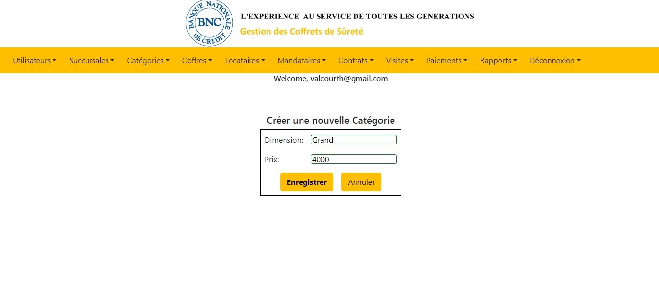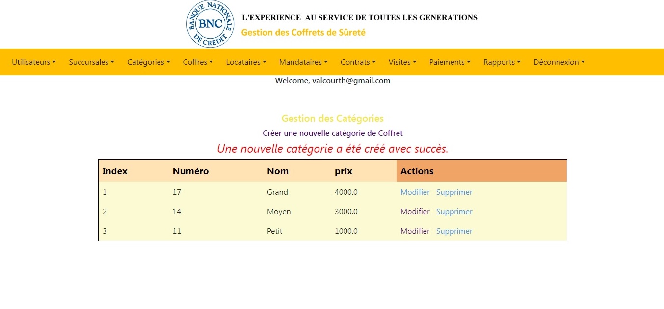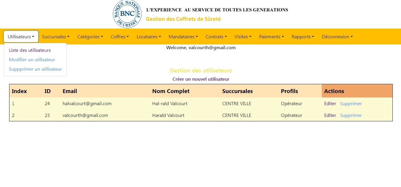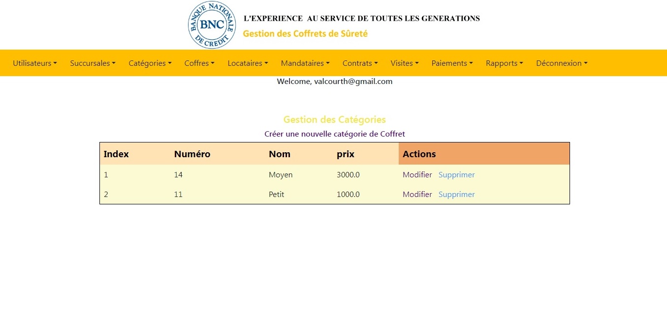Cette Application Web dynamique, développée en 2022, remplace l'ancienne application de Gestion des coffrets de sûreté de la BNC. Cette version permet aux Succursales de gérer les coffrets de sûreté, les locataires, les mandataires, les visites et les paiements.