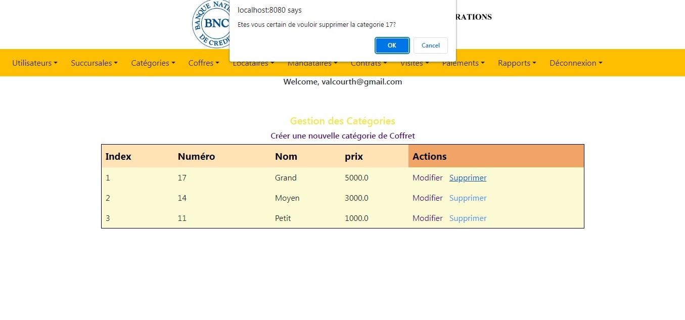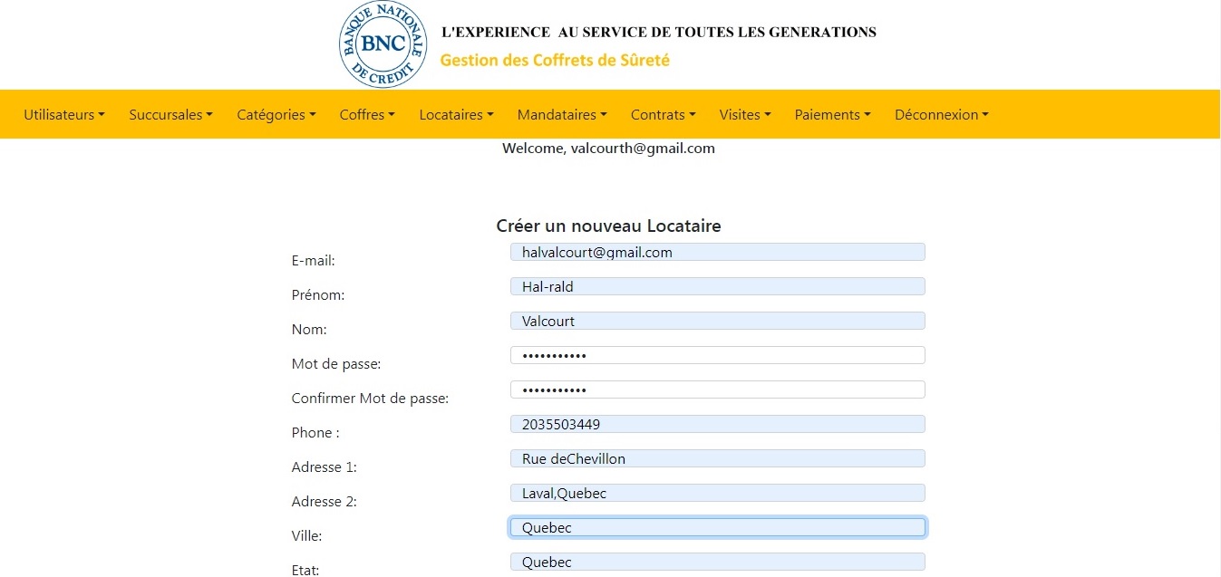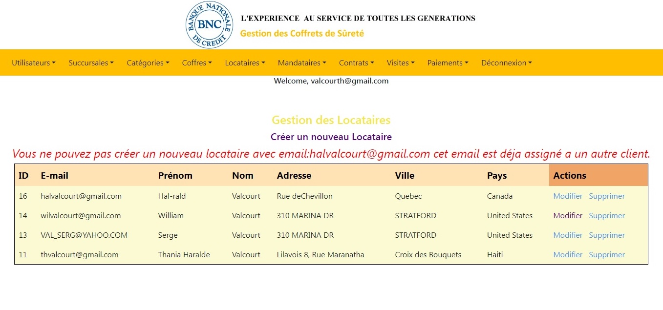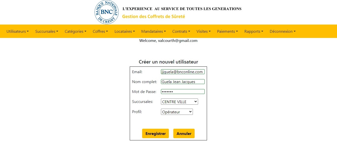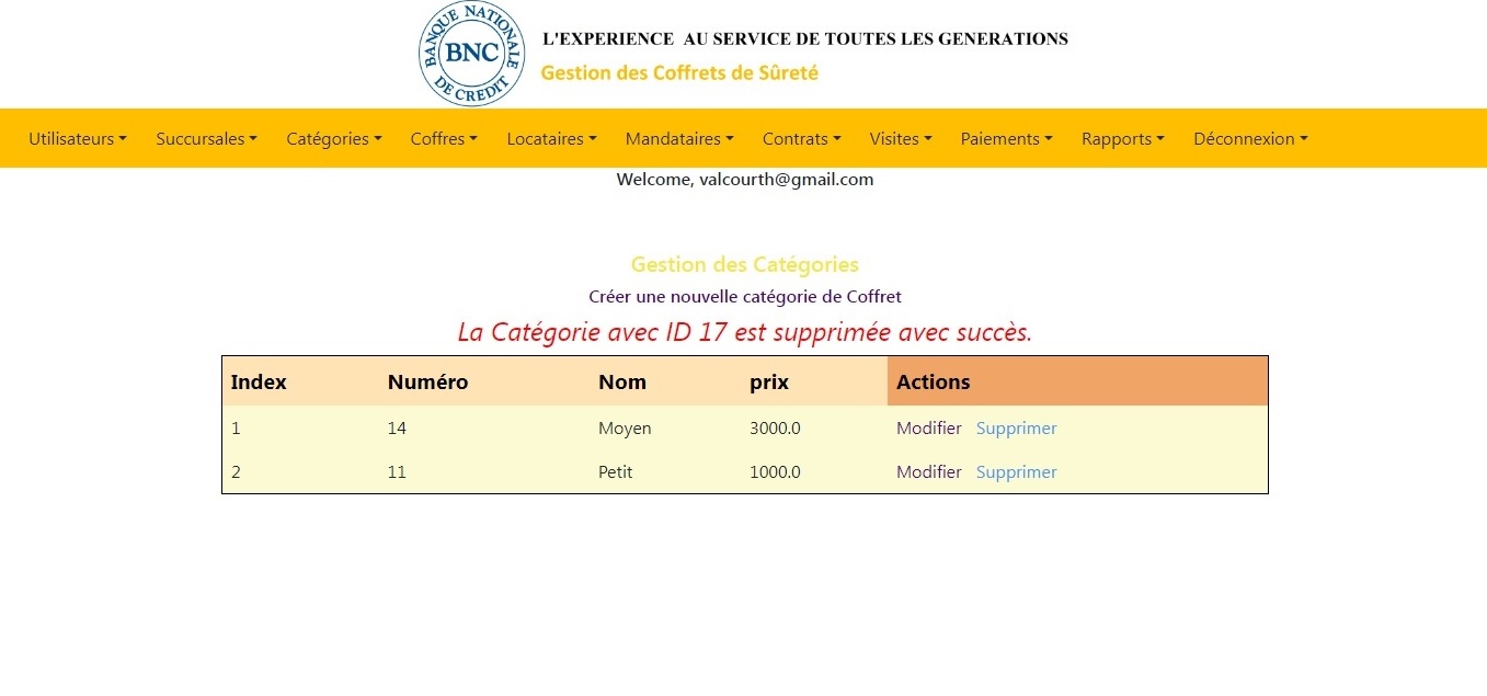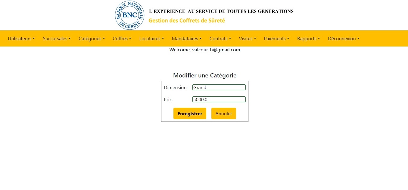 Cette Application Web dynamique, développée en 2022, remplace l'ancienne application de Gestion des coffrets de sûreté de la BNC. Cette version permet aux Succursales de gérer les coffrets de sûreté, les locataires, les mandataires, les visites et les paiements.