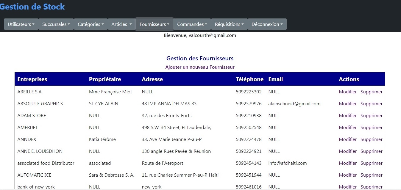 L'écran suivant permet à l'administrateur d'afficher, de créer, de modifier ou de supprimer les fournisseurs.