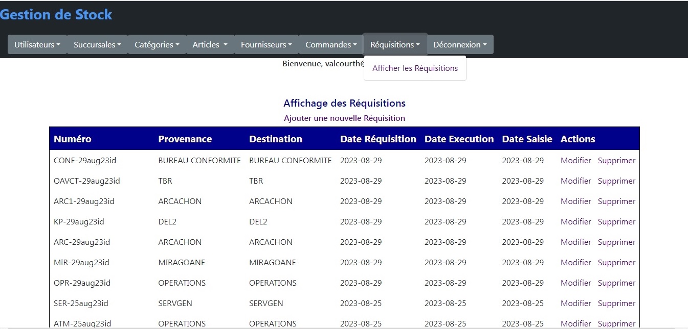L'écran suivant permet d'afficher, de créer, de modifier ou de supprimer les réquisitions.