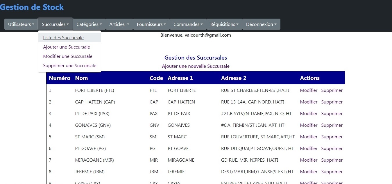 L'écran suivant permet à l'administrateur d'afficher, de créer, de modifier ou de supprimer les Succursales.