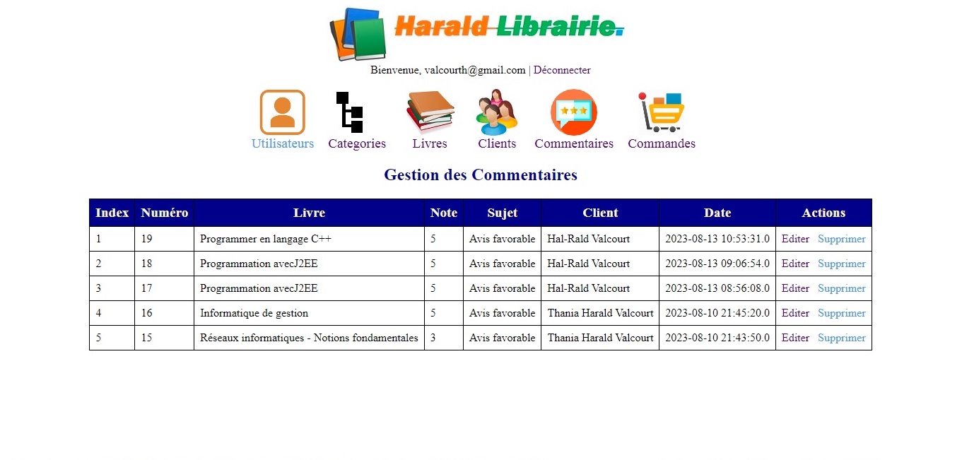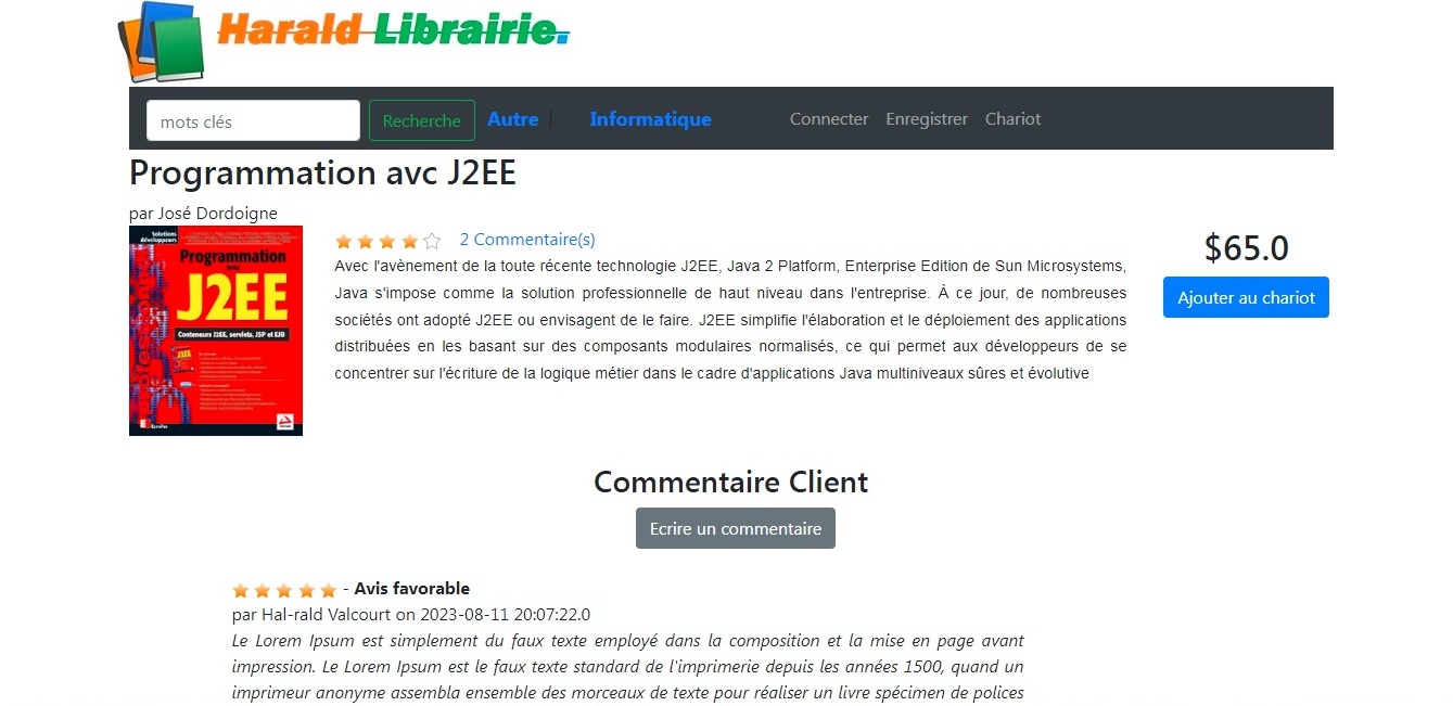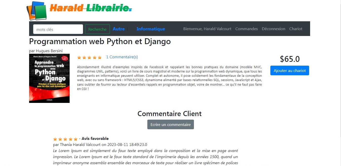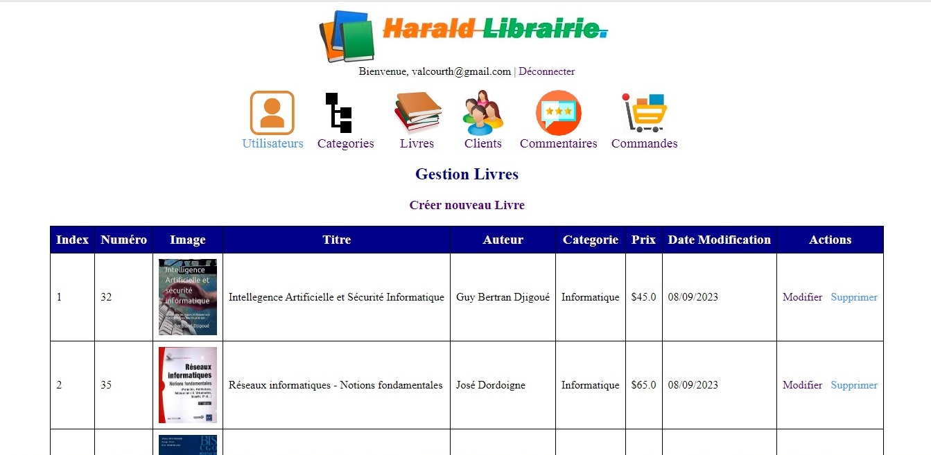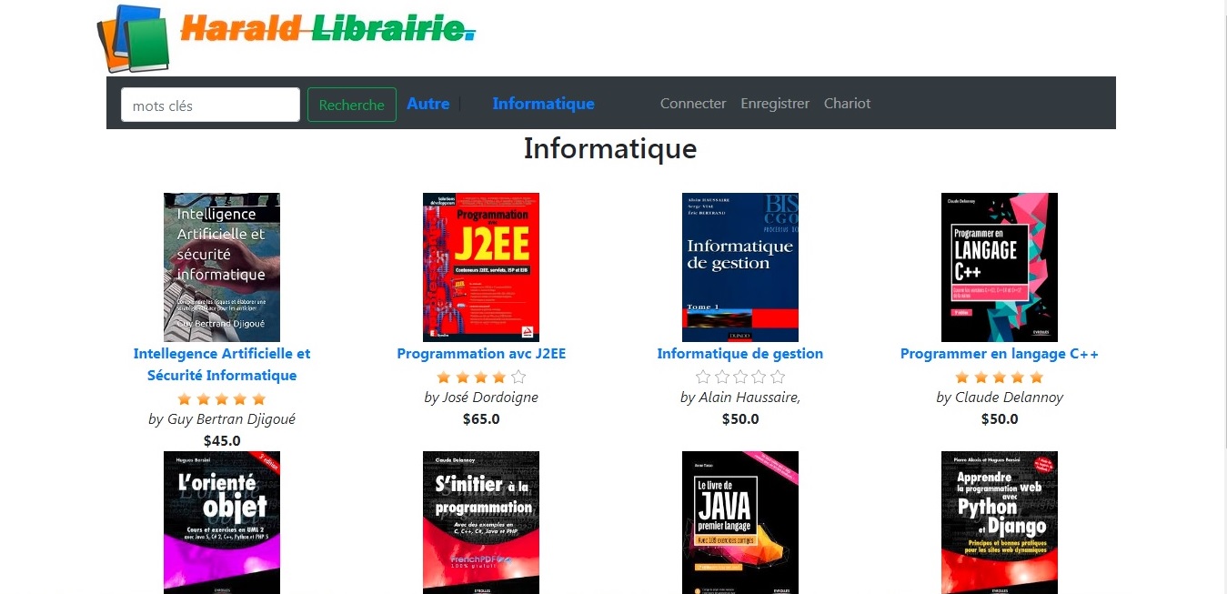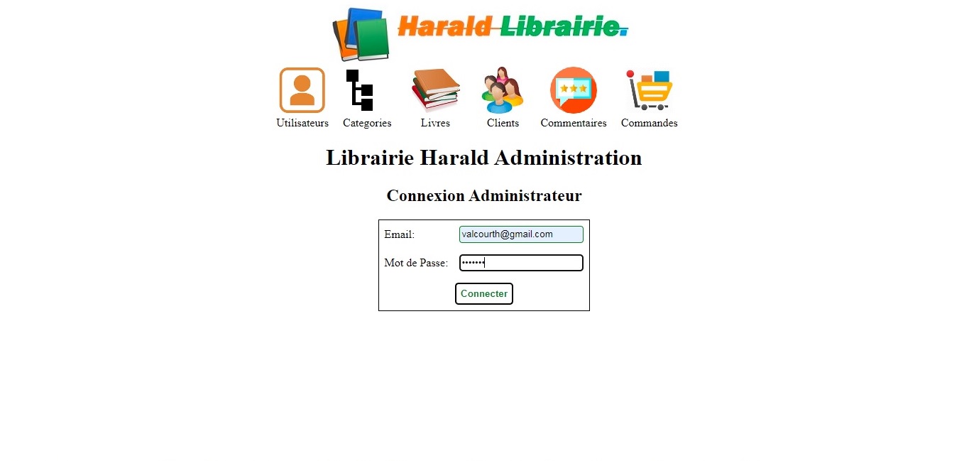 Cette application web permet à un utilisateur quelconque d'accéder aux informations relatives aux livres disponibles sur la librairie fictive en ligne: LibrairieHarald. Il peut les afficher en fonction de leur catégorie et accéder aux détails relatifs à chaque livre. Après inscription sur le site, il pourra ajouter des livres dans son chariot et enfin placer une commande. La commande en question sera alors livrée à l'adresse indiquée et le paiement se fera par cash au moment de la livraison. Cette application offre aussi une interface d'administration permettant à un employé de s'authentifier pour pouvoir gérer les utilisateurs, les clients, les livres, les catégories de livres, les commandes et les commentaires postés par les clients.