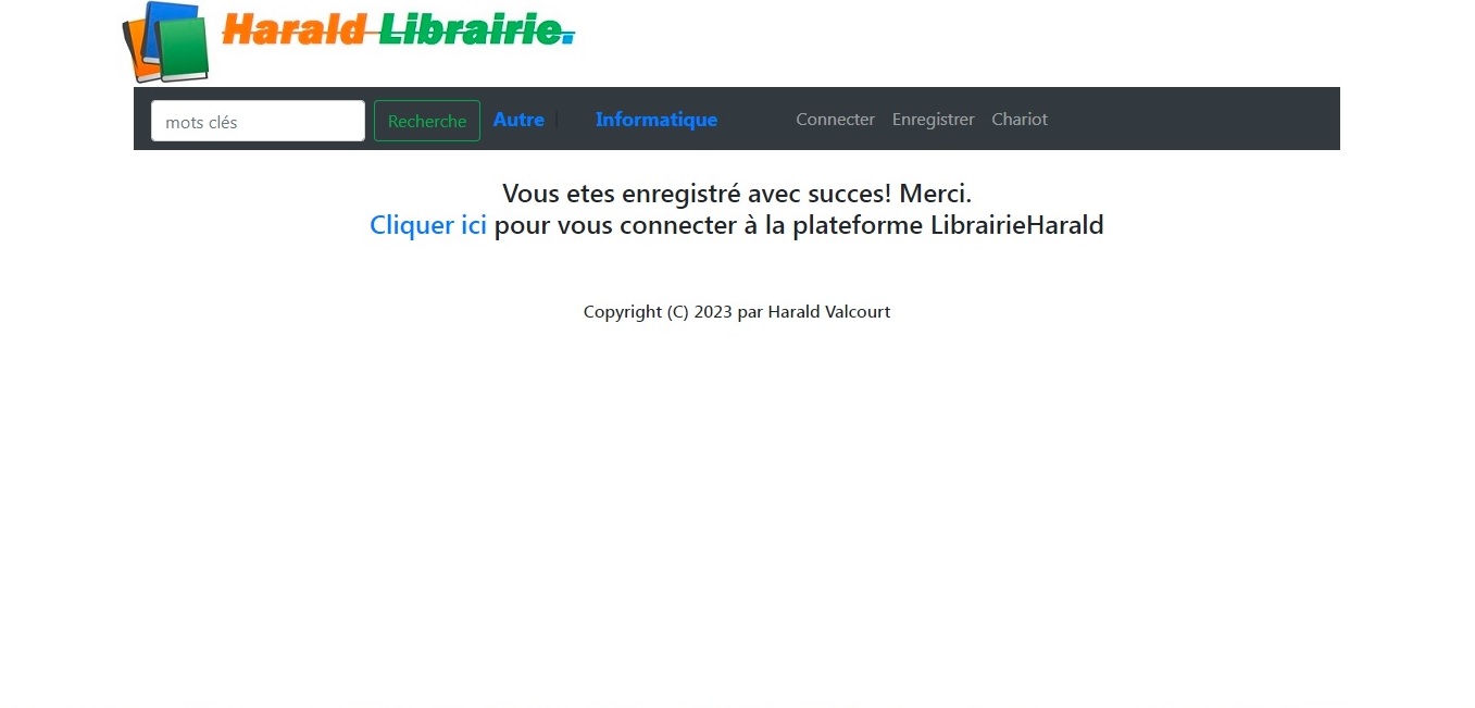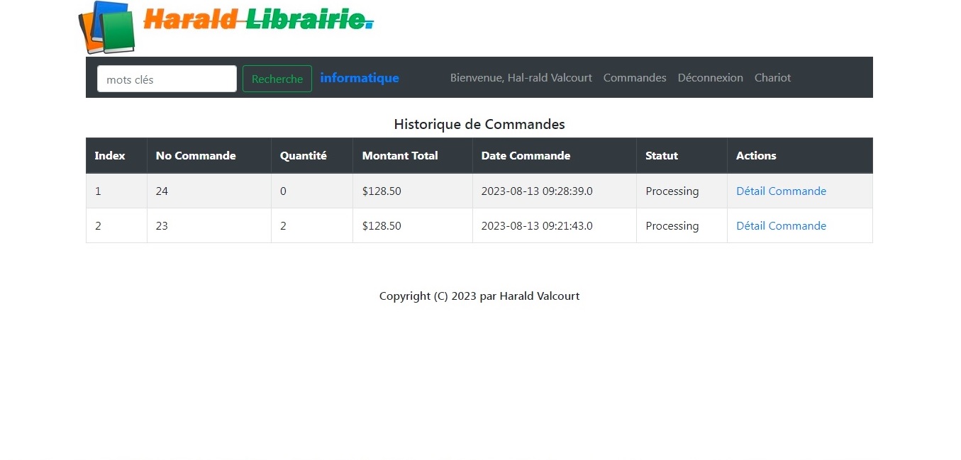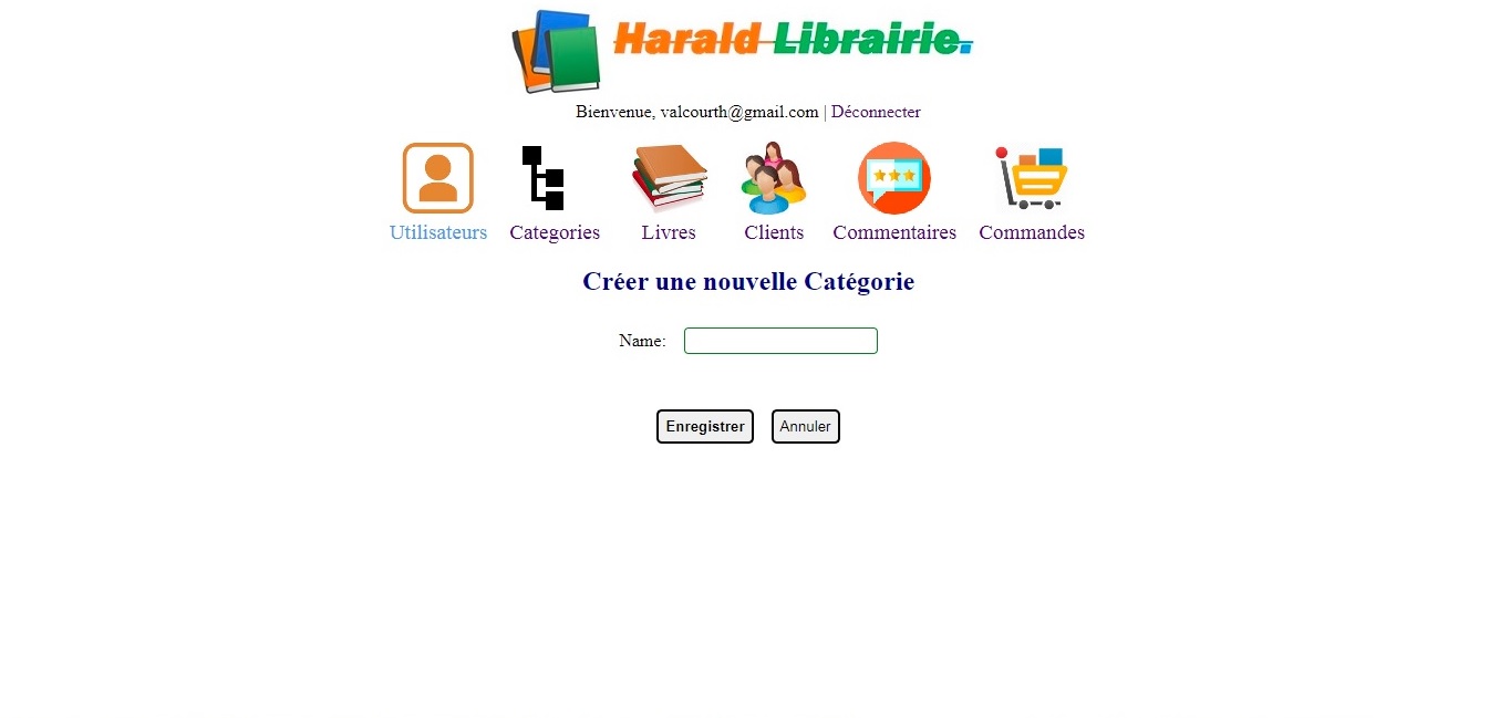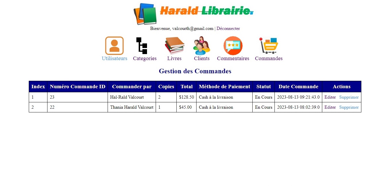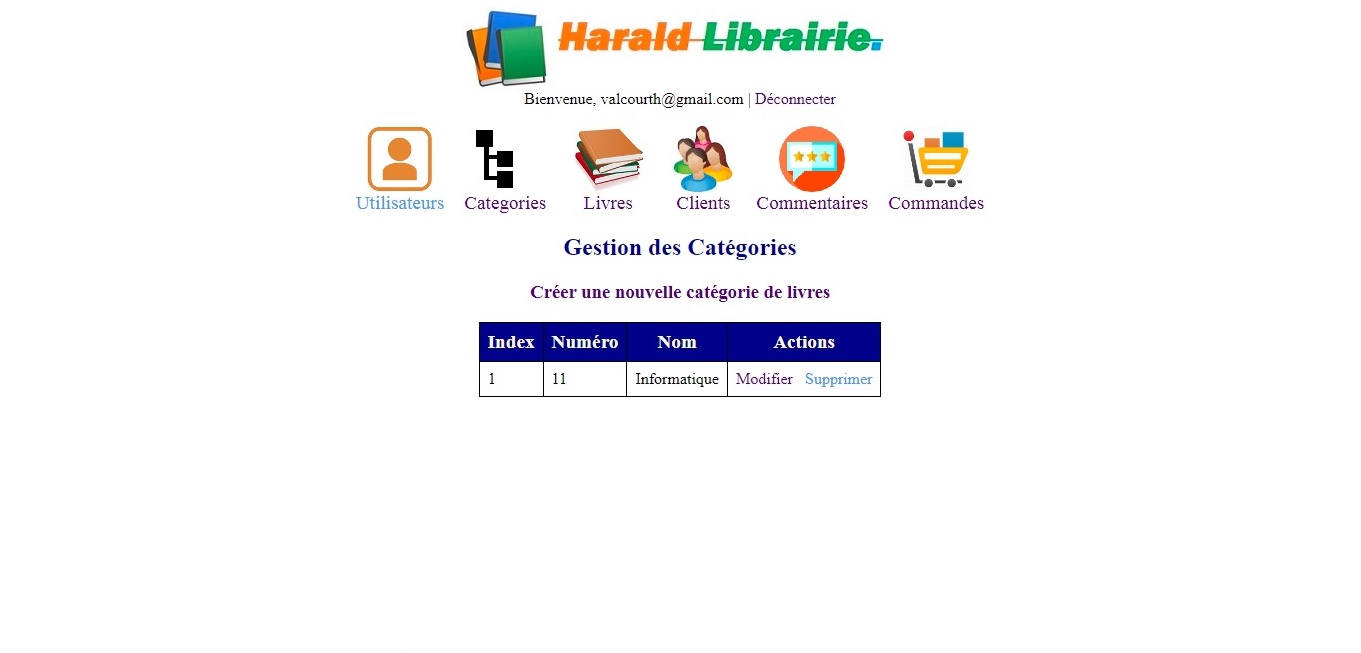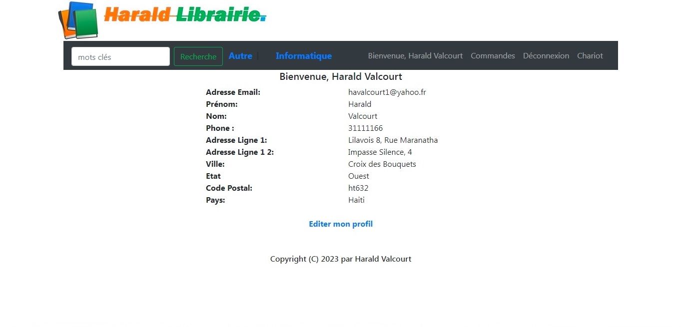 Cette application web permet à un utilisateur quelconque d'accéder aux informations relatives aux livres disponibles sur la librairie fictive en ligne: LibrairieHarald. Il peut les afficher en fonction de leur catégorie et accéder aux détails relatifs à chaque livre. Après inscription sur le site, il pourra ajouter des livres dans son chariot et enfin placer une commande. La commande en question sera alors livrée à l'adresse indiquée et le paiement se fera par cash au moment de la livraison. Cette application offre aussi une interface d'administration permettant à un employé de s'authentifier pour pouvoir gérer les utilisateurs, les clients, les livres, les catégories de livres, les commandes et les commentaires postés par les clients.