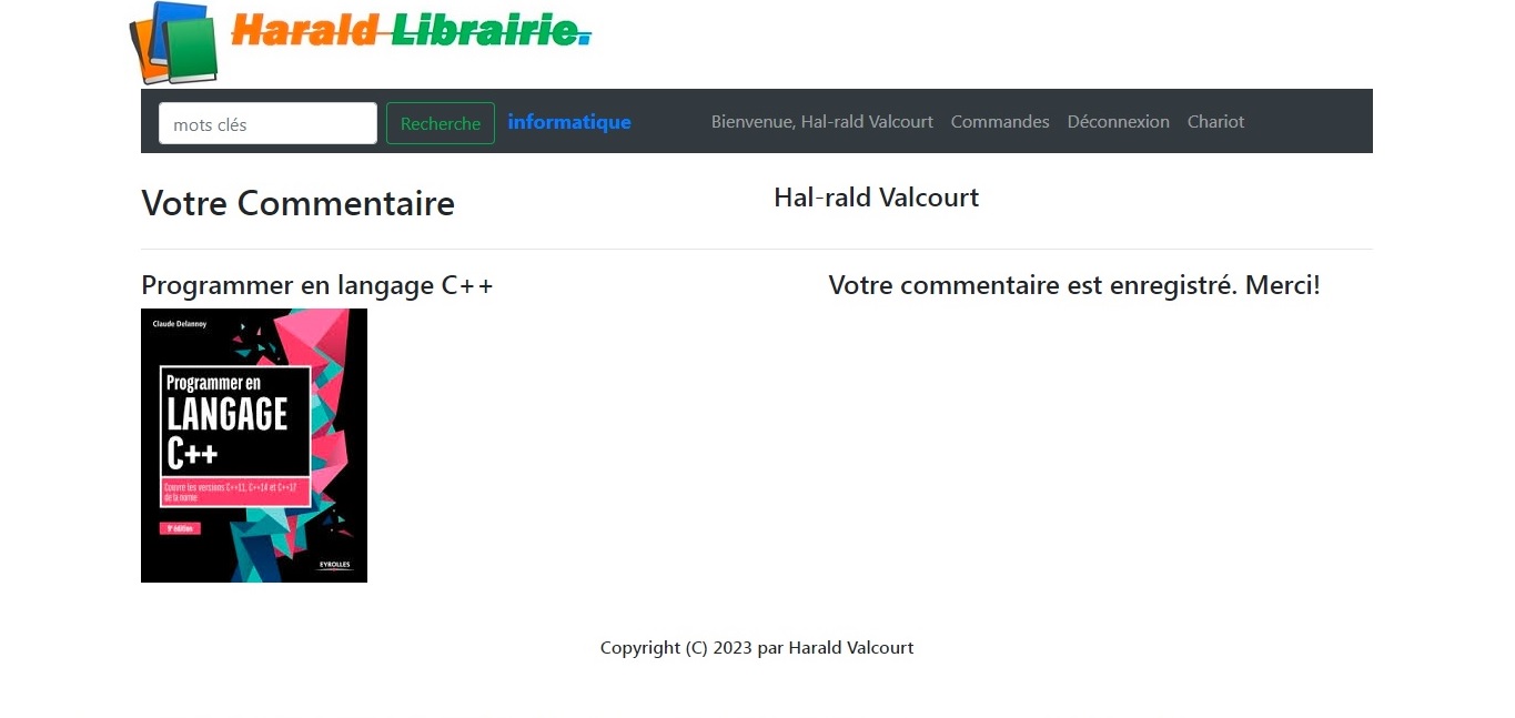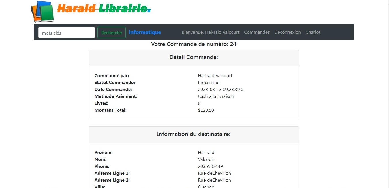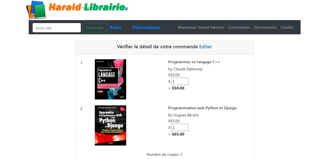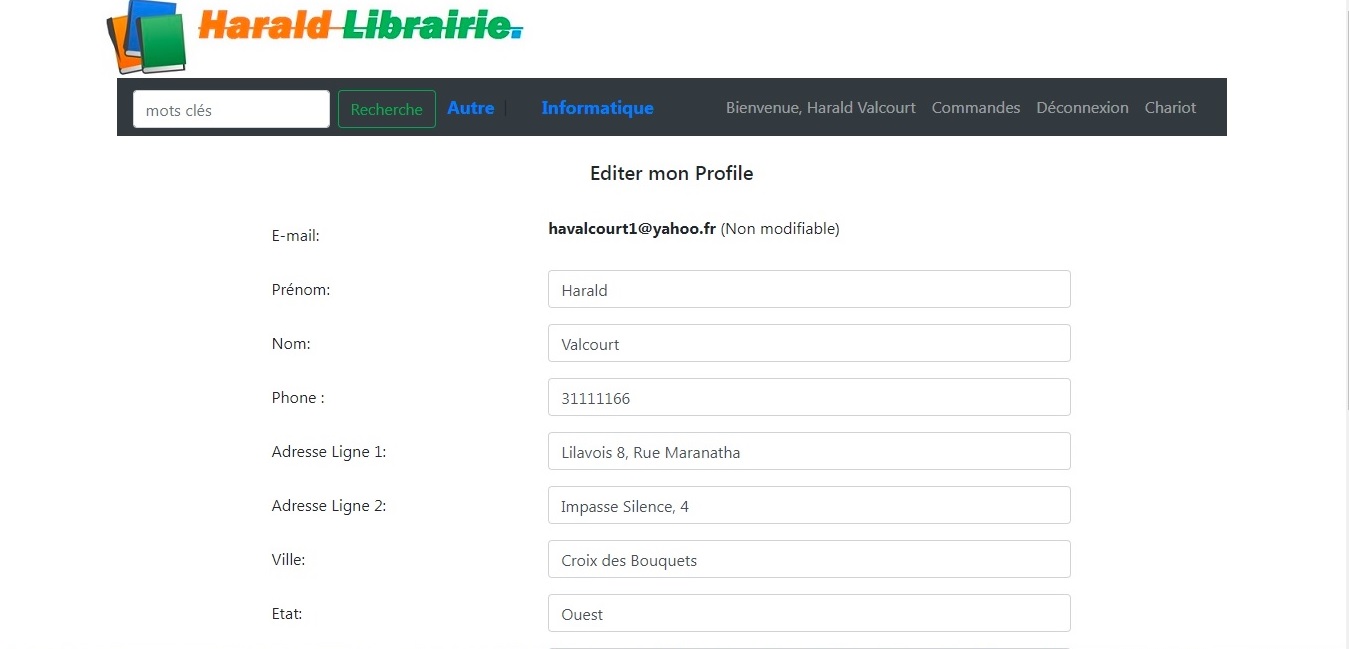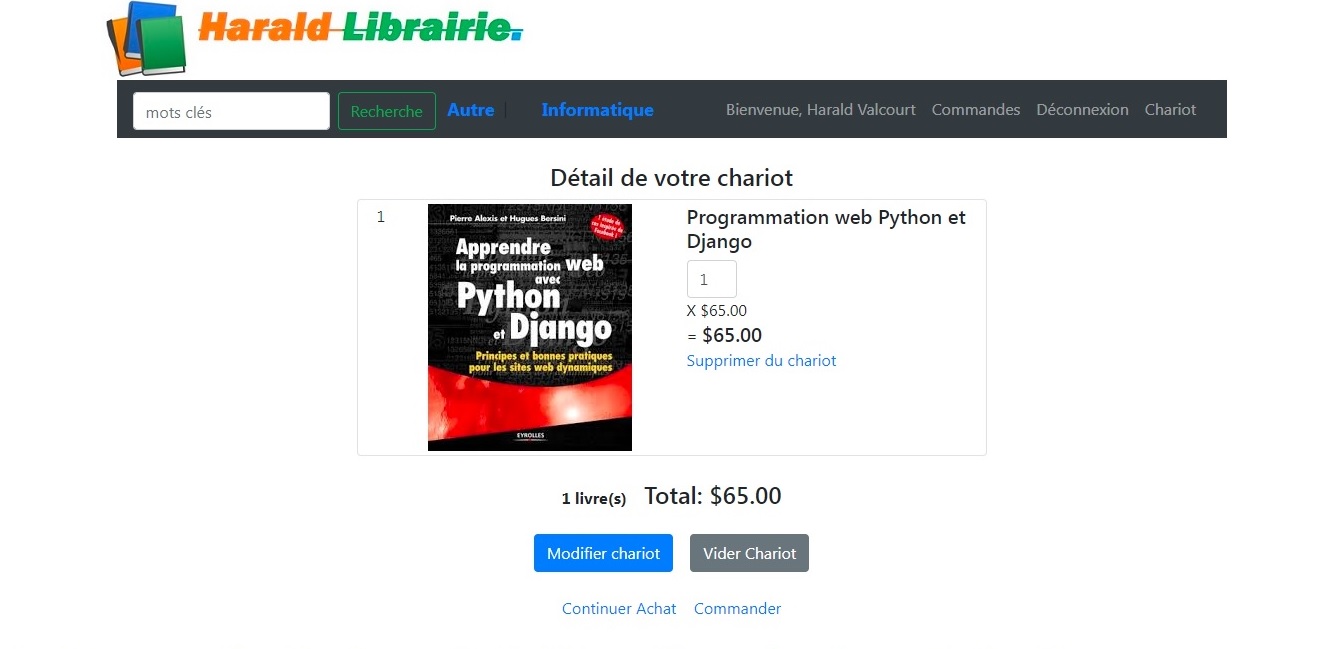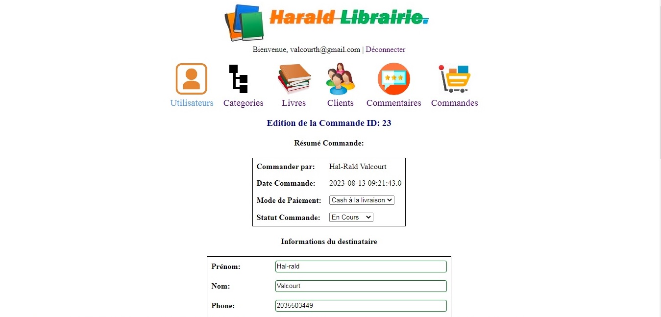 Cette application web permet à un utilisateur quelconque d'accéder aux informations relatives aux livres disponibles sur la librairie fictive en ligne: LibrairieHarald. Il peut les afficher en fonction de leur catégorie et accéder aux détails relatifs à chaque livre. Après inscription sur le site, il pourra ajouter des livres dans son chariot et enfin placer une commande. La commande en question sera alors livrée à l'adresse indiquée et le paiement se fera par cash au moment de la livraison. Cette application offre aussi une interface d'administration permettant à un employé de s'authentifier pour pouvoir gérer les utilisateurs, les clients, les livres, les catégories de livres, les commandes et les commentaires postés par les clients.