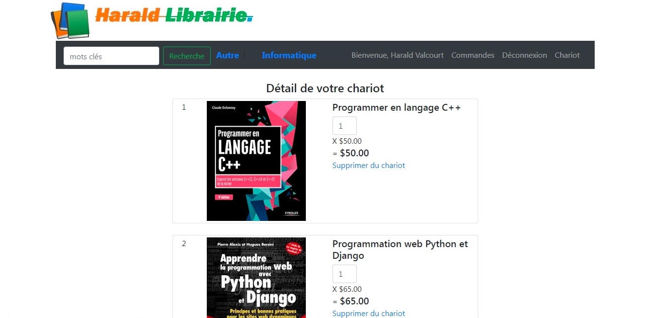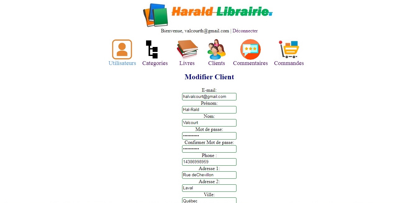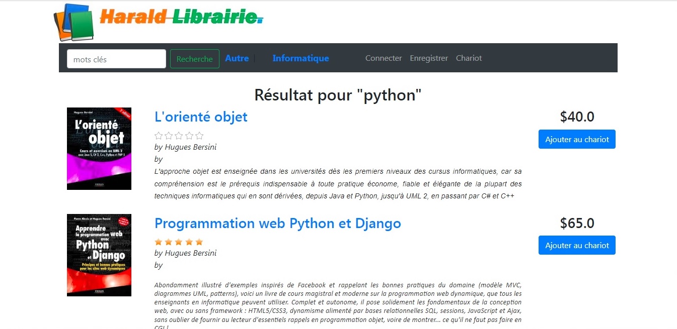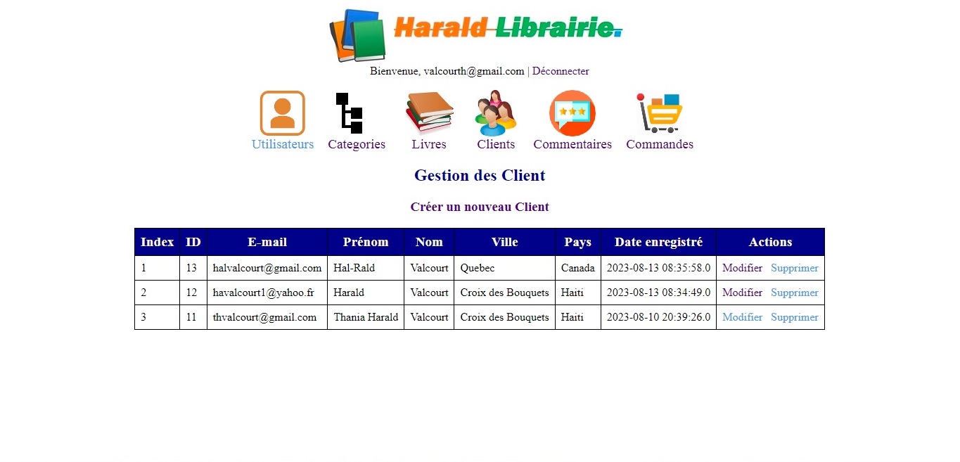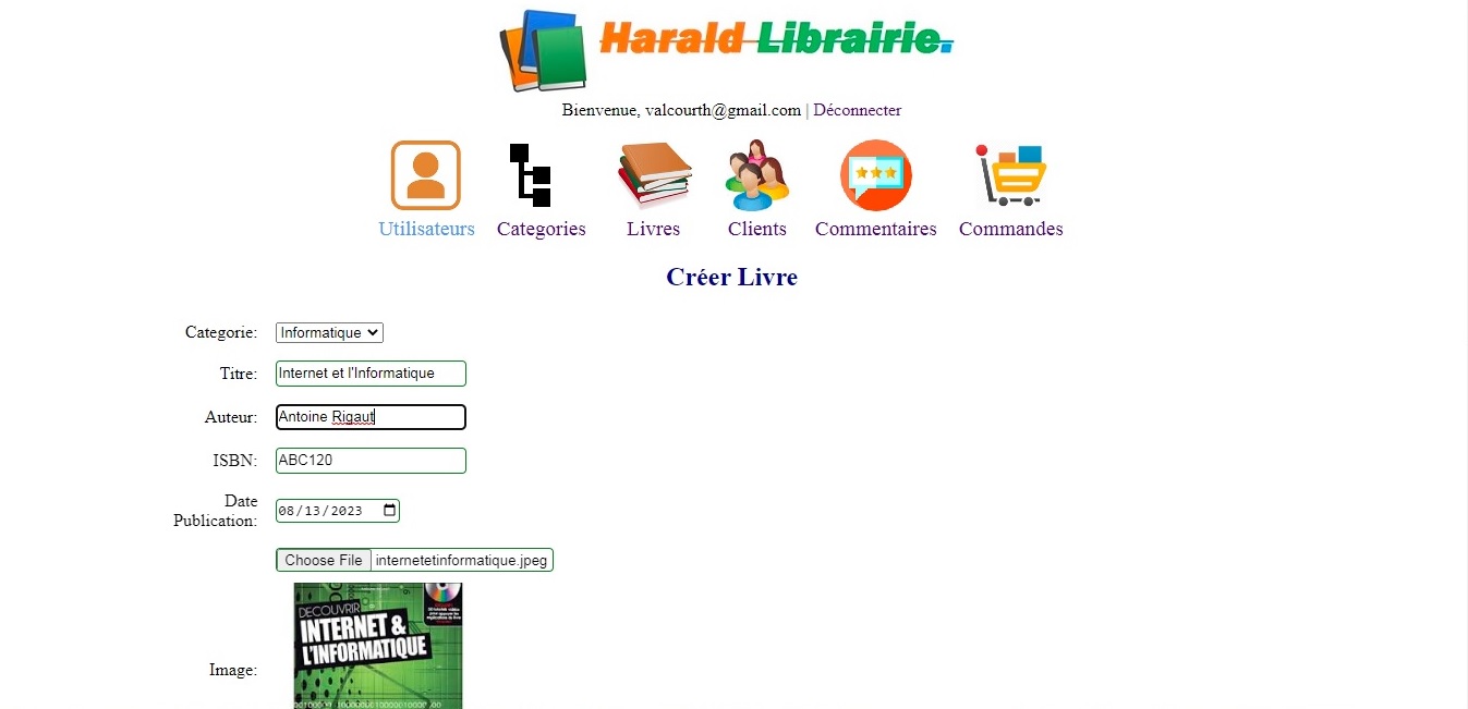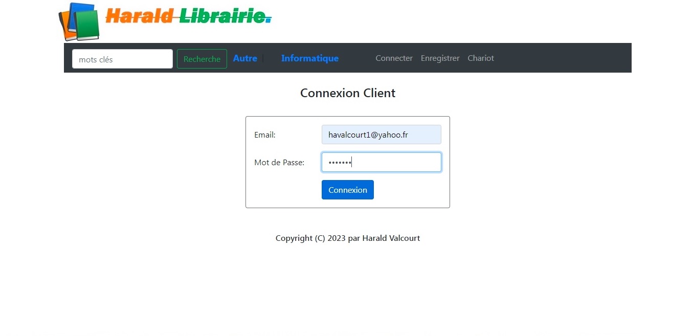 Cette application web permet à un utilisateur quelconque d'accéder aux informations relatives aux livres disponibles sur la librairie fictive en ligne: LibrairieHarald. Il peut les afficher en fonction de leur catégorie et accéder aux détails relatifs à chaque livre. Après inscription sur le site, il pourra ajouter des livres dans son chariot et enfin placer une commande. La commande en question sera alors livrée à l'adresse indiquée et le paiement se fera par cash au moment de la livraison. Cette application offre aussi une interface d'administration permettant à un employé de s'authentifier pour pouvoir gérer les utilisateurs, les clients, les livres, les catégories de livres, les commandes et les commentaires postés par les clients.
