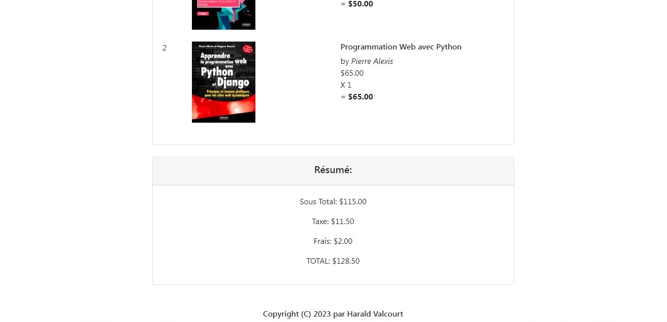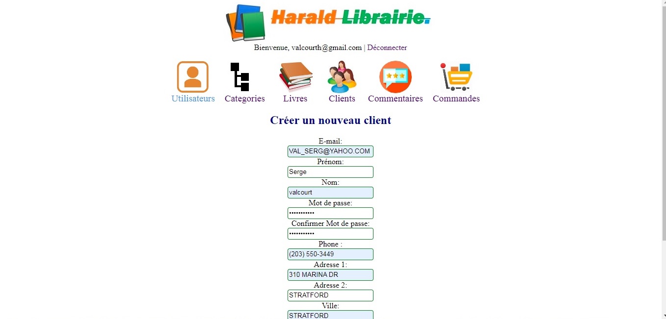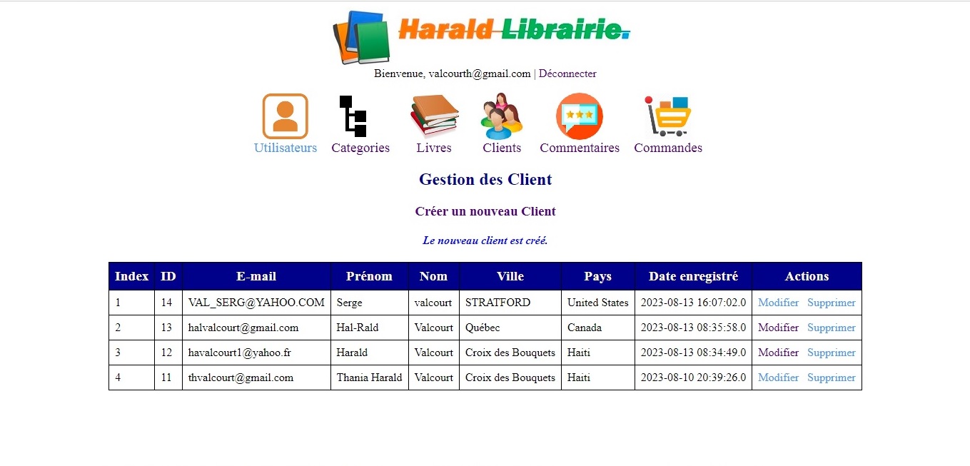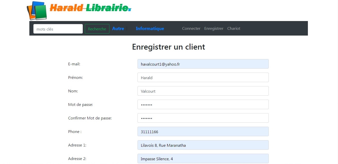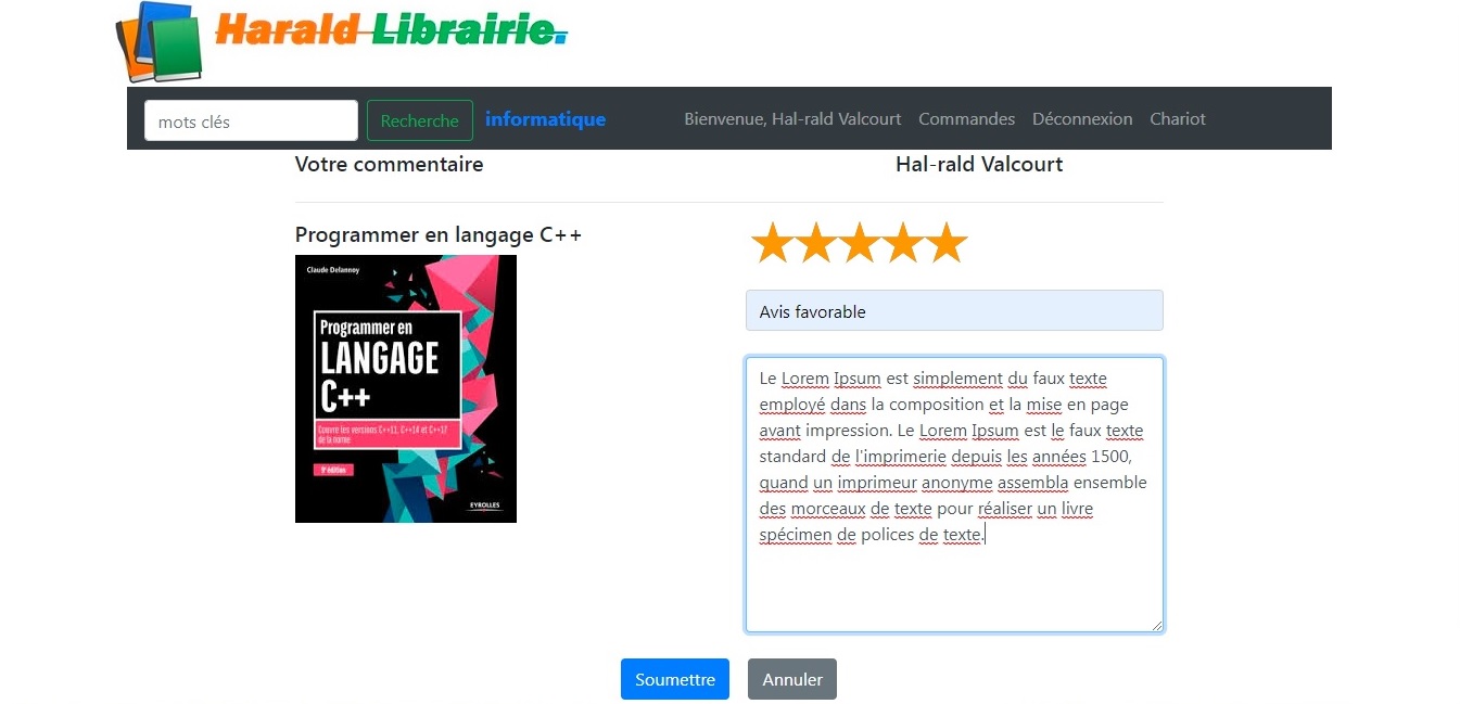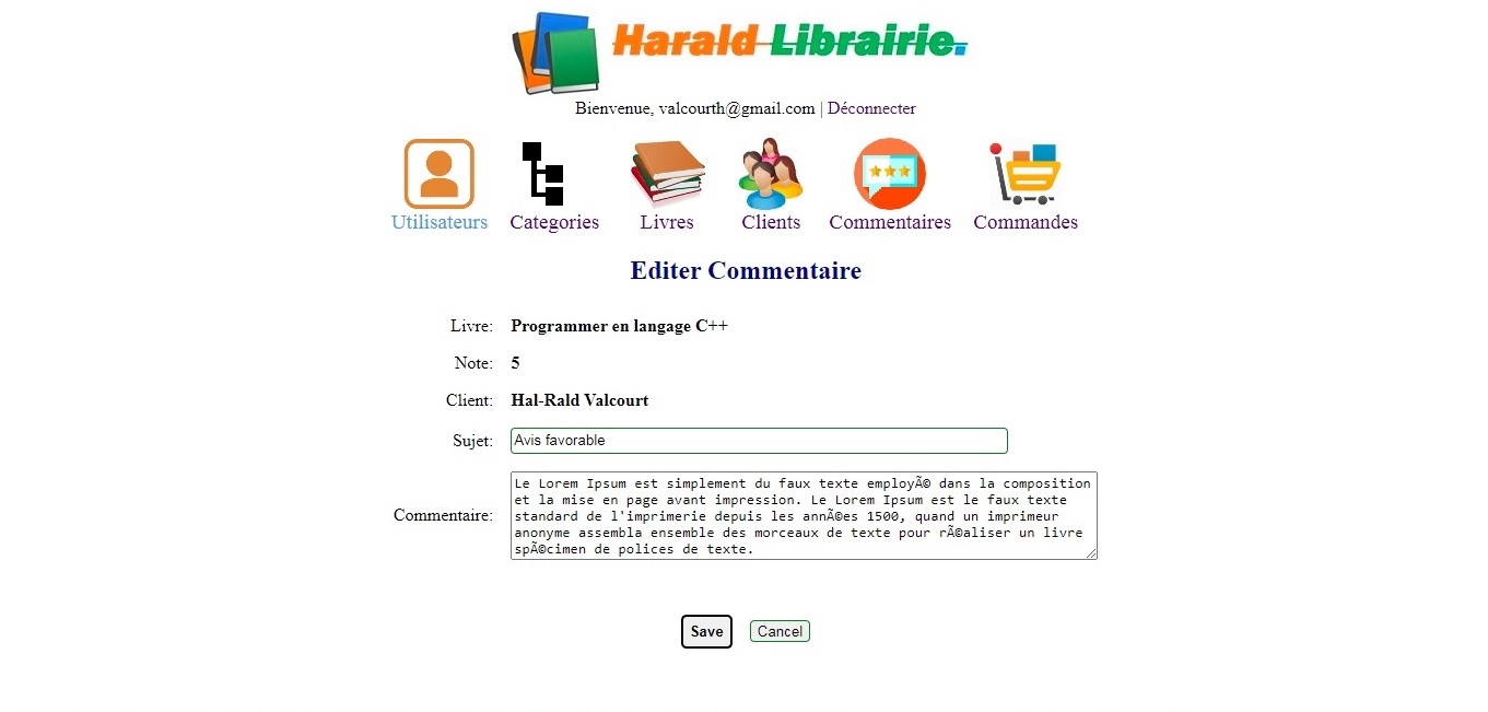 Cette application web permet à un utilisateur quelconque d'accéder aux informations relatives aux livres disponibles sur la librairie fictive en ligne: LibrairieHarald. Il peut les afficher en fonction de leur catégorie et accéder aux détails relatifs à chaque livre. Après inscription sur le site, il pourra ajouter des livres dans son chariot et enfin placer une commande. La commande en question sera alors livrée à l'adresse indiquée et le paiement se fera par cash au moment de la livraison. Cette application offre aussi une interface d'administration permettant à un employé de s'authentifier pour pouvoir gérer les utilisateurs, les clients, les livres, les catégories de livres, les commandes et les commentaires postés par les clients.