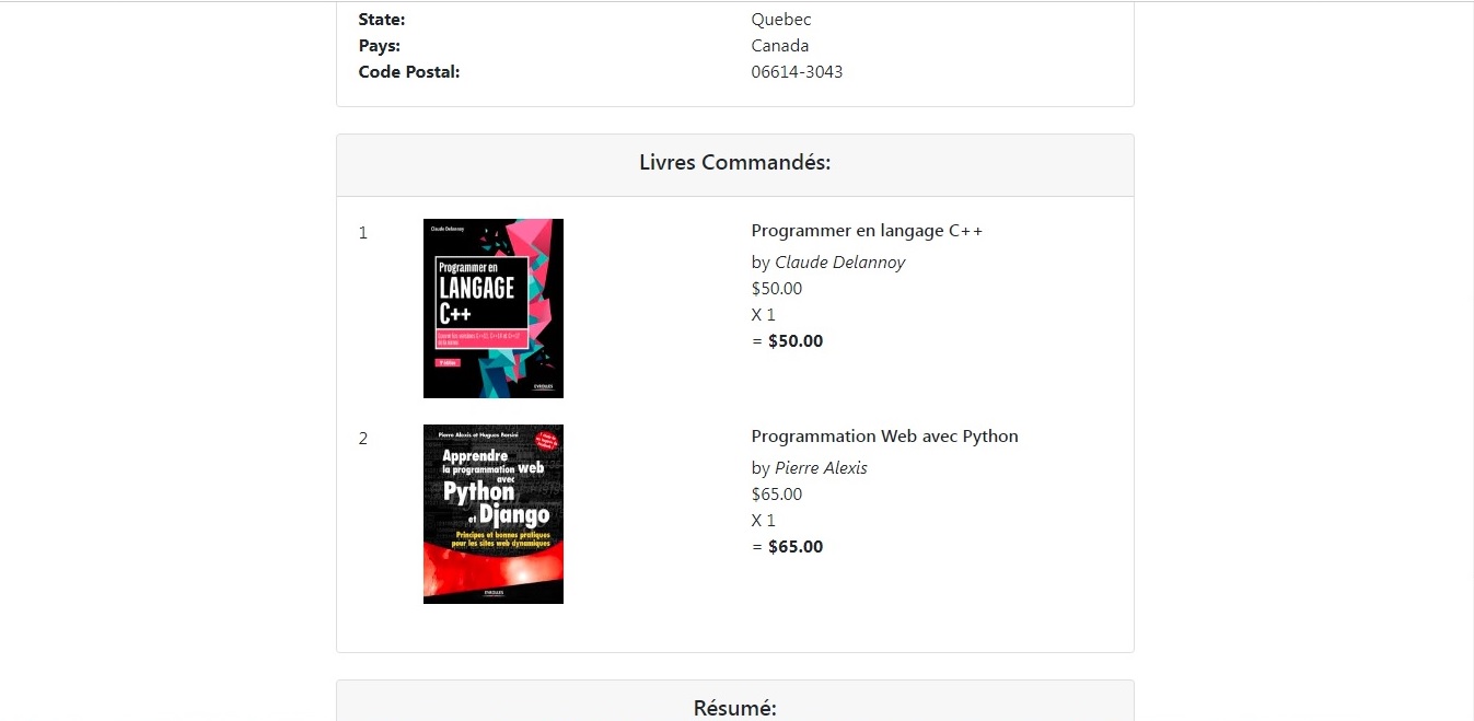 Les écrans suivants permettent au client de visualiser le détail d'une commande placée.