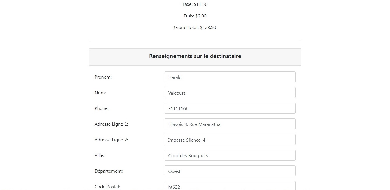Les écrans suivants permettent au client de placer sa commande. Les informations du destinataire sont collectées automatiquement à la Base de Données.