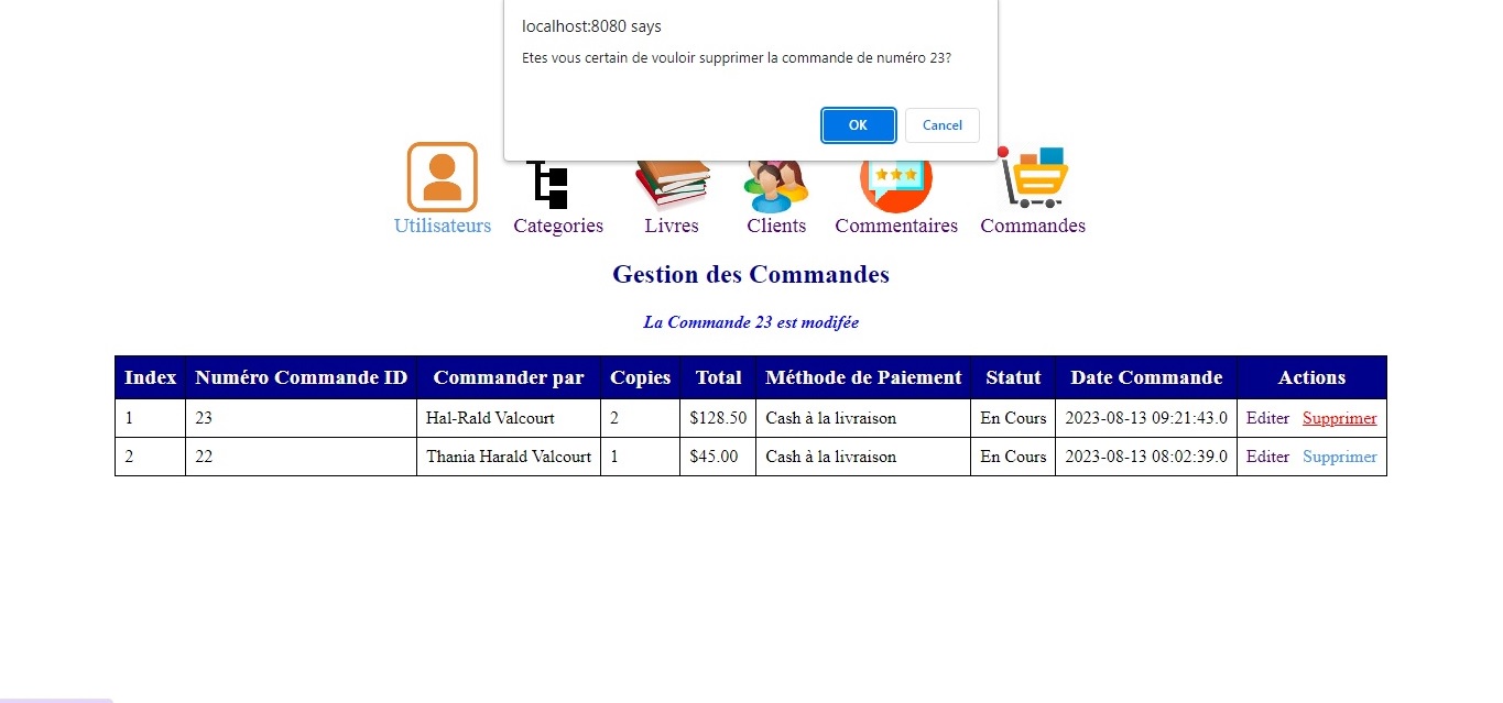 Le texte "Supprimer" permet à l'administrateur de supprimer une commande après confirmation .
