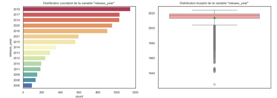L'écran suivant affiche les distibutions countplot et boxplot de la variable release_year