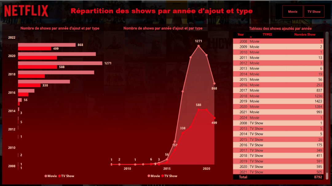 L'écran suivant affiche la répartition des shows par année d'ajout et type.