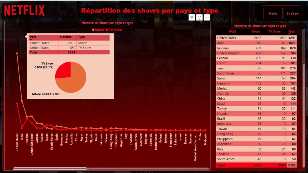 L'écran suivant affiche la répartition des shows par pays et types