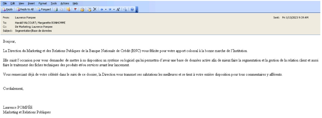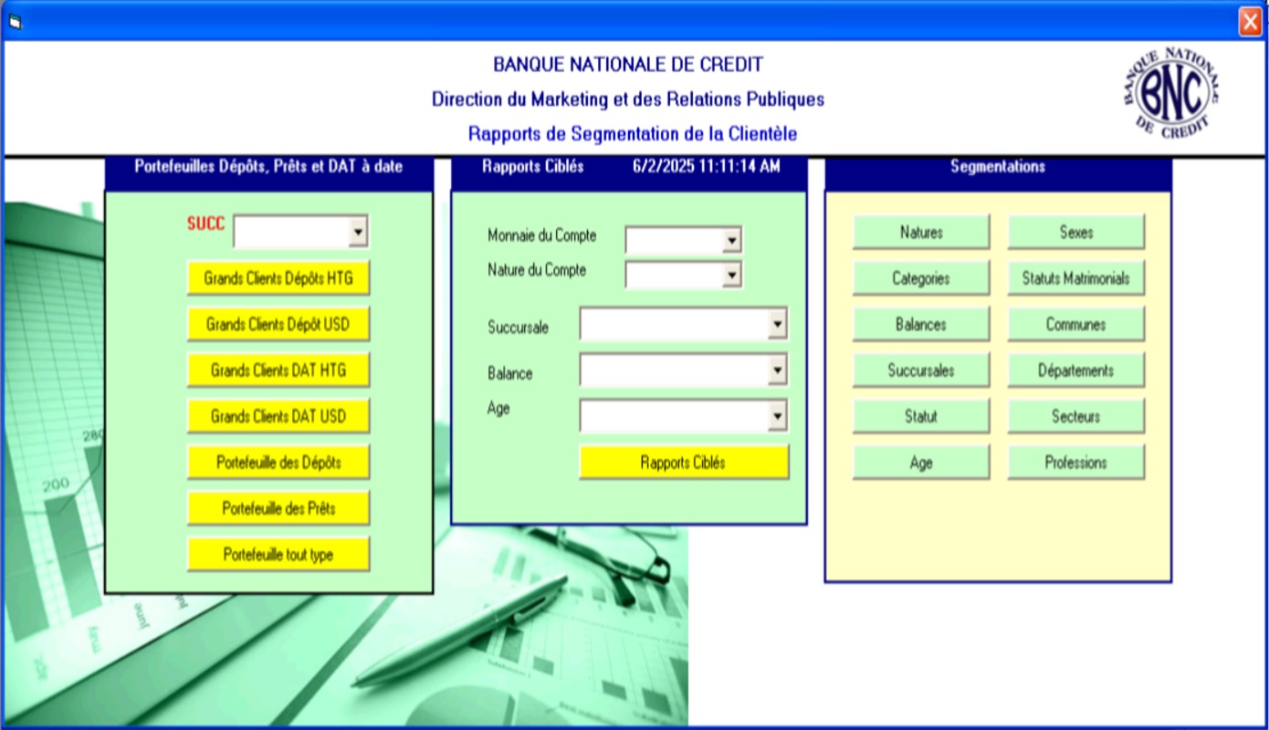 Ce projet répond à une demande formulée par la Direction du Marketing et des Relations Publiques de la Banque Nationale de Crédit (BNC). Son objectif est de mettre à la disposition de cette Direction une interface permettant la génération des rapports statistiques relatifs à la segmentation de la clientèle en fonction de différents critères ainsi qu’un tableau de bord. L’interface de génération des rapports est connectée directement à l’environnement de production AS400/DB2. Pour ce qui a trait au tableau de bord les données sont périodiquement extraites de l'environnement de production, traitées et modélisées dans une Base de données SQL Server puis visualisées à travers Microsoft Excel